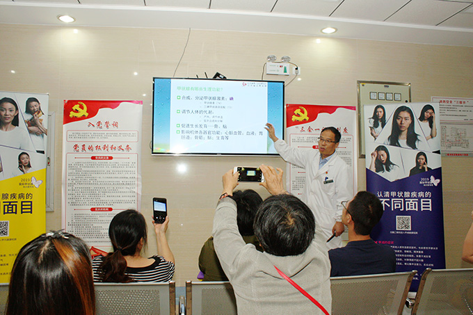 2019年第十一屆國際甲狀腺知識宣傳周的主題為“認清甲狀腺疾病的不同面目”。由于甲狀腺疾病癥狀隱匿且不典型,導(dǎo)致公眾對該疾病的知曉率偏低、整體規(guī)范治療率不足,為提高人民群眾對甲狀腺健康的重視、引導(dǎo)高危人群及時進行甲狀腺相關(guān)檢查,5月31日,我所江蘇省江原醫(yī)院開展了“甲狀腺周江原日”活動。