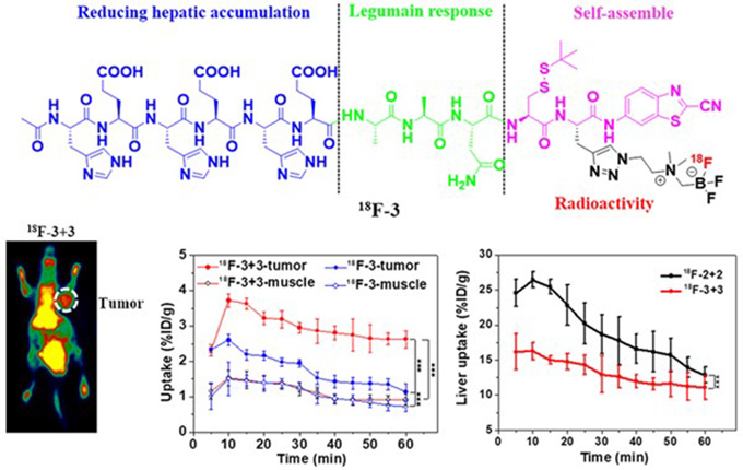 在上述實驗基礎上,研究團隊還進行了引入標記和共注射策略的優化實驗:通過在探針18F-3中引入三組組氨酸-谷氨酸親水肽鏈(HE)3標記,顯著減少肝臟蓄積,而不影響腫瘤攝??;采用共注射策略(18F-2 + 2和18F-3+ 3)使腫瘤攝取顯著增加,信噪比顯著提高。結果表明,探針18F-3對監測天冬酰胺內肽酶在腫瘤中的表達水平具有良好的特異性與靈敏度,對天冬酰胺內肽酶過表達相關的疾病在早期發現與療效監測方面具有較好的應用潛力。(創新藥物研究中心)
