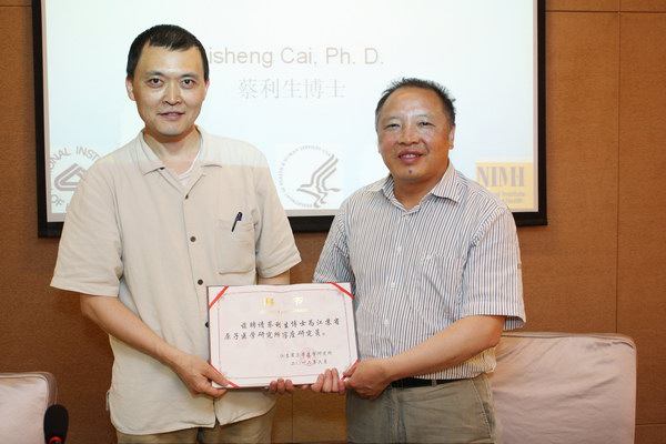 6月13日,羅世能所長(zhǎng)向美國(guó)國(guó)立衛(wèi)生研究院(NIH)、國(guó)立精神衛(wèi)生研究所(NIMH)蔡利生博士頒發(fā)了聘書(shū),聘請(qǐng)他為我所客座研究員。蔡博士主要從事正電子放射性藥物的研究,尤其在診斷老年癡呆癥、焦慮癥等神經(jīng)退行性疾病的放藥研究方面頗有建樹(shù)。當(dāng)日,蔡博士為我所科研人員作了題為“表達(dá)在血腦屏障 (BBB) 上的 P-gp 蛋白質(zhì)功能 PET 成像”的學(xué)術(shù)報(bào)告,并與大家進(jìn)行了熱烈討論與交流。近年來(lái),我所堅(jiān)持招才與引智并舉,大力引進(jìn)外部智力為我所用,先后聘請(qǐng)了多名國(guó)內(nèi)外知名大學(xué)、科研機(jī)構(gòu)的專家為我所客座研究員,提升我所的科研創(chuàng)新能力。(科教科 張波 文/圖)
