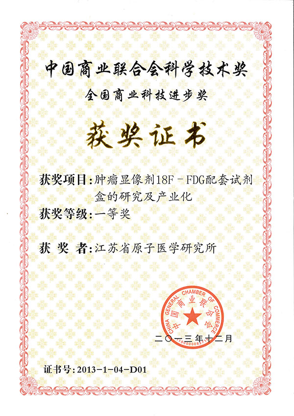 近日,我所“腫瘤顯像劑18F-FDG配套試劑盒的研究及產(chǎn)業(yè)化”項(xiàng)目喜獲中國(guó)商業(yè)聯(lián)合會(huì)全國(guó)商業(yè)科技進(jìn)步獎(jiǎng)一等獎(jiǎng)。