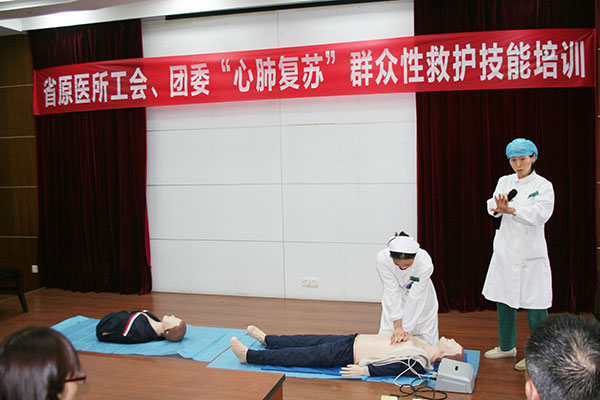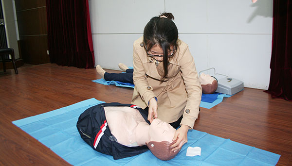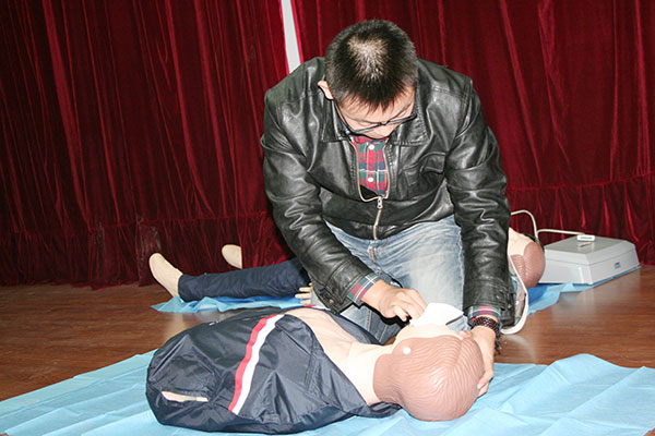 眾所周知,心搏驟停大部分發生在院外,而大腦耐受缺氧的時間僅有短短的4-6分鐘,這也是搶救猝死的最佳黃金時間,如果此時能夠及時給予有效的心肺復蘇,或許就能救人一命。訓練開始,護理部的二位老師非常認真的將2010版心肺復蘇的主要流程邊演示、邊解說,判斷、呼救、解衣寬帶、按壓、人工呼吸,部位、時間、次數、深度交代清楚,整個流程緊張而熟練,一氣呵成,充分體現了時間就是生命。接下來是學員輪流上臺在人體模型上練習,老師在旁邊悉心指導,學員們認真的練習每一個步驟、每一個動作,練到基本標準為止。最后,全部練習結束,在另一個有電腦提示的人體模型上檢驗自己的心肺復蘇是否成功。此次培訓,每個學員都按要求到臺上進行模擬訓練,并基本掌握了心肺復蘇要領。