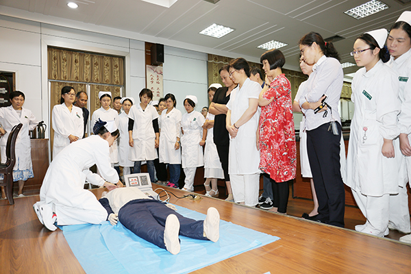 此次培訓通過理論授課、觀看視頻、現場演示及手把手指導等方式進行。培訓老師通過PPT詳細解讀了新版心肺復蘇的基本原則、操作規范、方法及步驟,用生動、形象的語言,將大家帶到一個身臨其境的急救現場。接著操作老師在現場為大家詳細演示了操作要領:判斷是否喪失意識、判斷有無自主呼吸、判斷有無脈搏,進行胸外心臟按壓,清理口腔異物,人工呼吸等。實際操練環節,在培訓老師的現場指導、點評和糾正下,大家對每一個急救環節都進行了模擬操作和反復練習。通過培訓,強化了職工的現場急救意識,掌握了心肺復蘇的操作要領,起到了良好的醫學急救知識科普教育效果。(團委 滕芬)