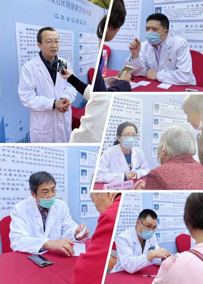 江蘇省江原醫院義診團隊由來自內分泌科、外科、神經內科、腫瘤科、超聲科、核醫學科的8位副主任醫師以上的專家組成。他們發揮業務專長,為現場絡繹不絕的問診群眾提供甲狀腺疾病相關的專業幫助和其他方面疾病的健康建議,贏得現場群眾的好評贊譽。還有多位患者在江原醫院義診區偶遇熟悉的就診專家,驚喜之余現場分享自己的健康近況,展示自己的治療成效,對江原專家的感謝之情和重獲健康的信心溢于言表。